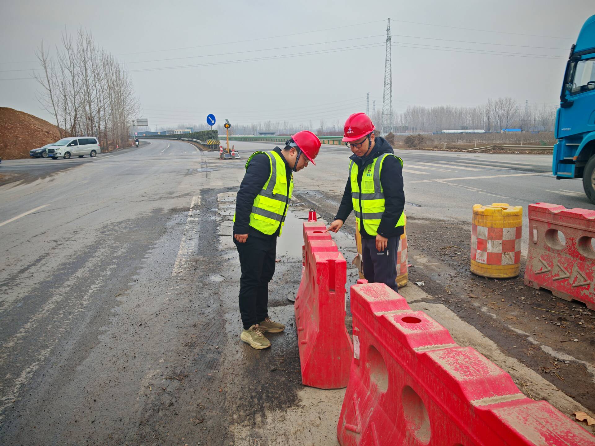 徐淮阜交安機電綠化工程項目技術(shù)負責人張楠楠和核算員鄭全勝正在進行涉路道口安全檢查